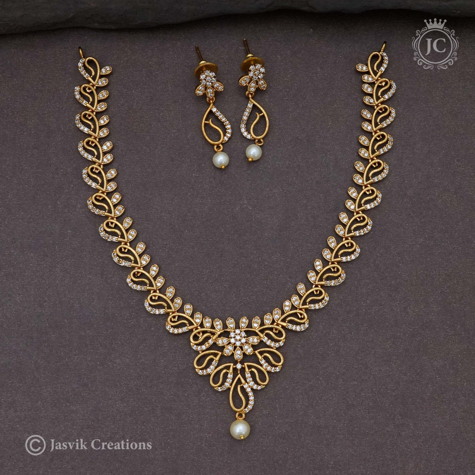 Design: The necklace features a series of intricate leaf-like motifs that are meticulously studded with small, brilliant white American Diamond (AD) stones. These motifs are arranged in a delicate pattern that forms the main body of the necklace, creating a graceful curve. The centerpiece of the necklace is a larger, symmetrical, floral-like design from which a single, pearl-like bead dangles, adding a classic and elegant touch.