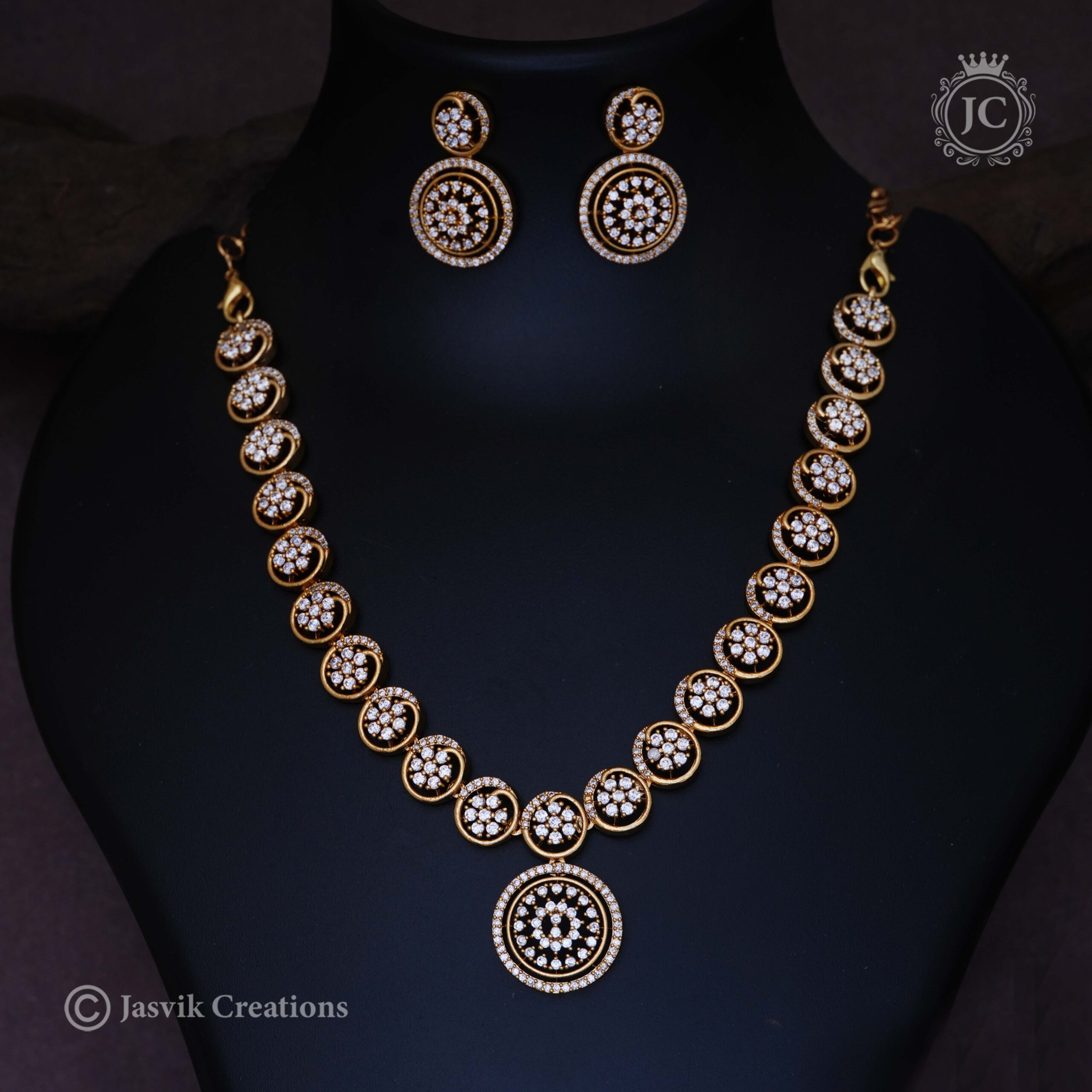 Design: The necklace is a single strand made of interconnected circular motifs. The center of each motif is a beautiful, intricate floral pattern created by a cluster of American Diamonds (AD). This central floral cluster is then framed by a larger circle of small, brilliant ADs, creating a stunning halo effect. The central pendant is a larger version of this motif, with a double halo of ADs.