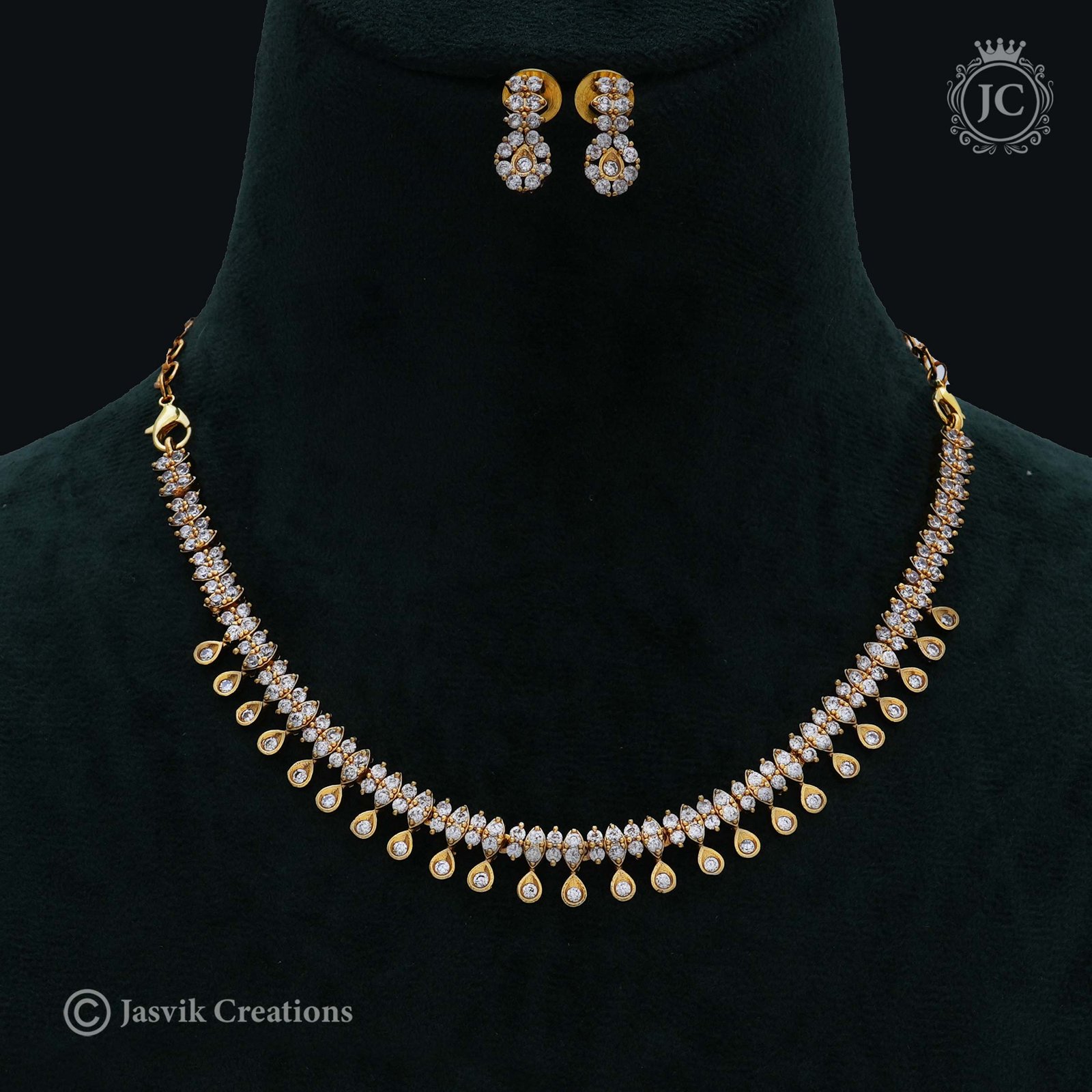 Necklace: The necklace is a choker or close-fitting style, designed to sit gracefully along the collarbone. It consists of a continuous band of intricate white AD stone settings.
