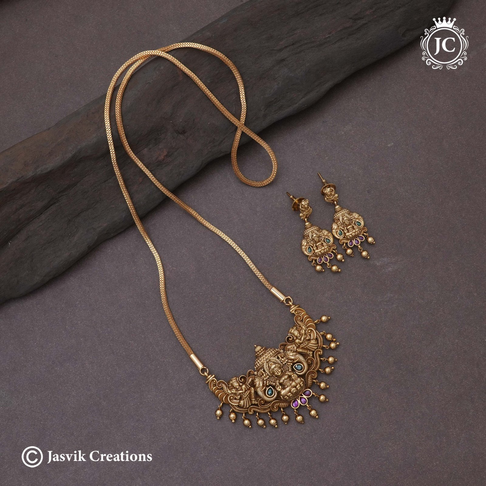 Pendant: The centerpiece is a prominent, intricately detailed pendant. It features a divine figure, possibly a goddess like Lakshmi or a similar deity, seated within an ornate, temple-like frame. The craftsmanship is highly detailed, with a mix of smooth and textured surfaces. Small circular beads or droplets dangle from the bottom of the pendant, adding movement and elegance. The design incorporates small, colorful stones, possibly blue and red or purple, giving it a subtle pop of color. The overall style is reminiscent of traditional South Indian temple jewelry.