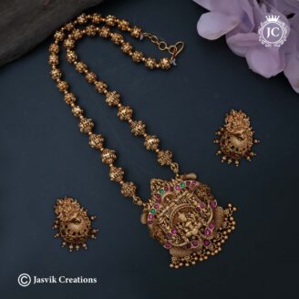 Finish: The jewelry has a “premium antique” or “matte” finish. This gives it a dull, reddish-gold tone that distinguishes it from bright, shiny gold jewelry. This finish is a hallmark of traditional temple jewelry and is what gives the piece its vintage and heirloom-like appearance.