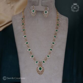Stones: The defining feature of this haram is the prominent use of green stones. These are typically high-quality Kemp stones or American Diamond (CZ) stones in emerald or other green shades. These are often set against white stones to create a striking contrast. Pearls are also frequently incorporated as small drops or in clusters, adding to the classic, luxurious feel.