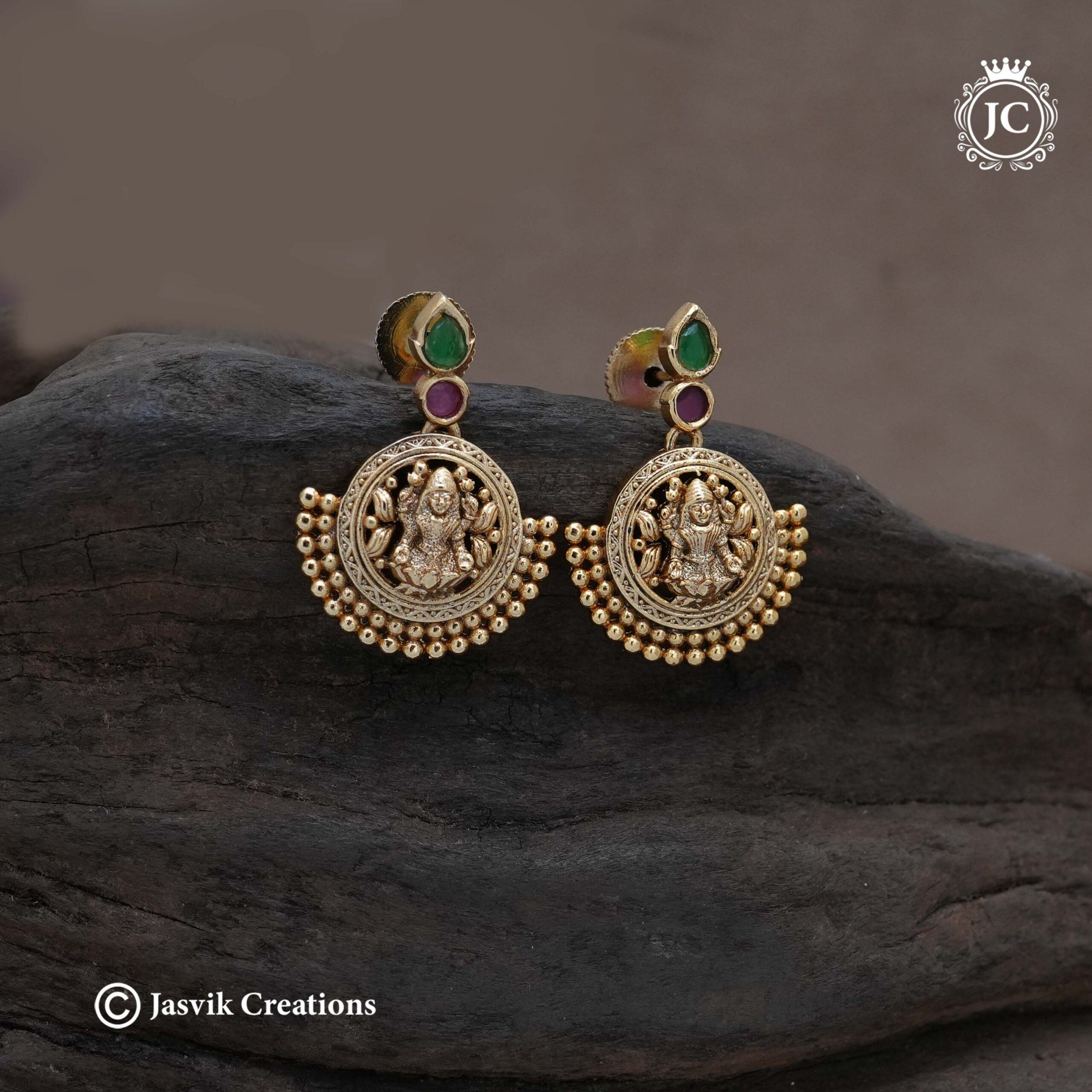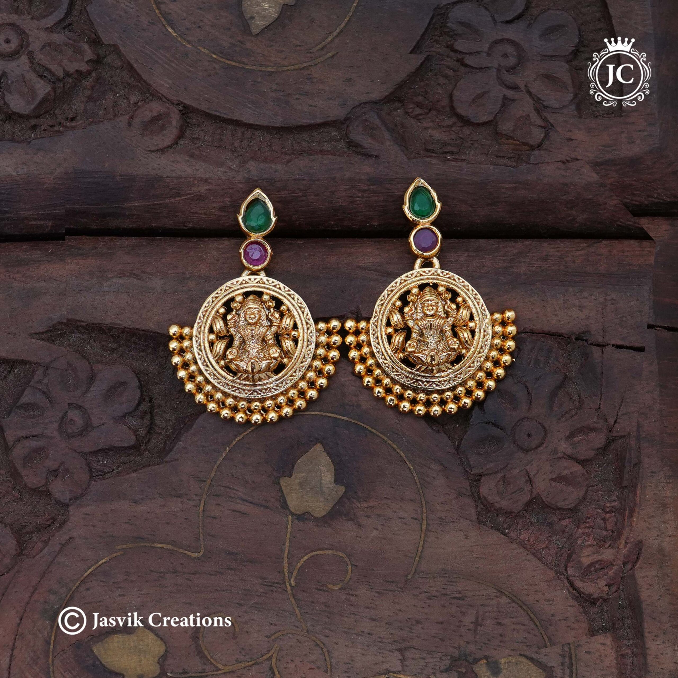 This pair of earrings from Jasvik Creations is designed with a traditional aesthetic, often referred to as “Temple Jewelry”.