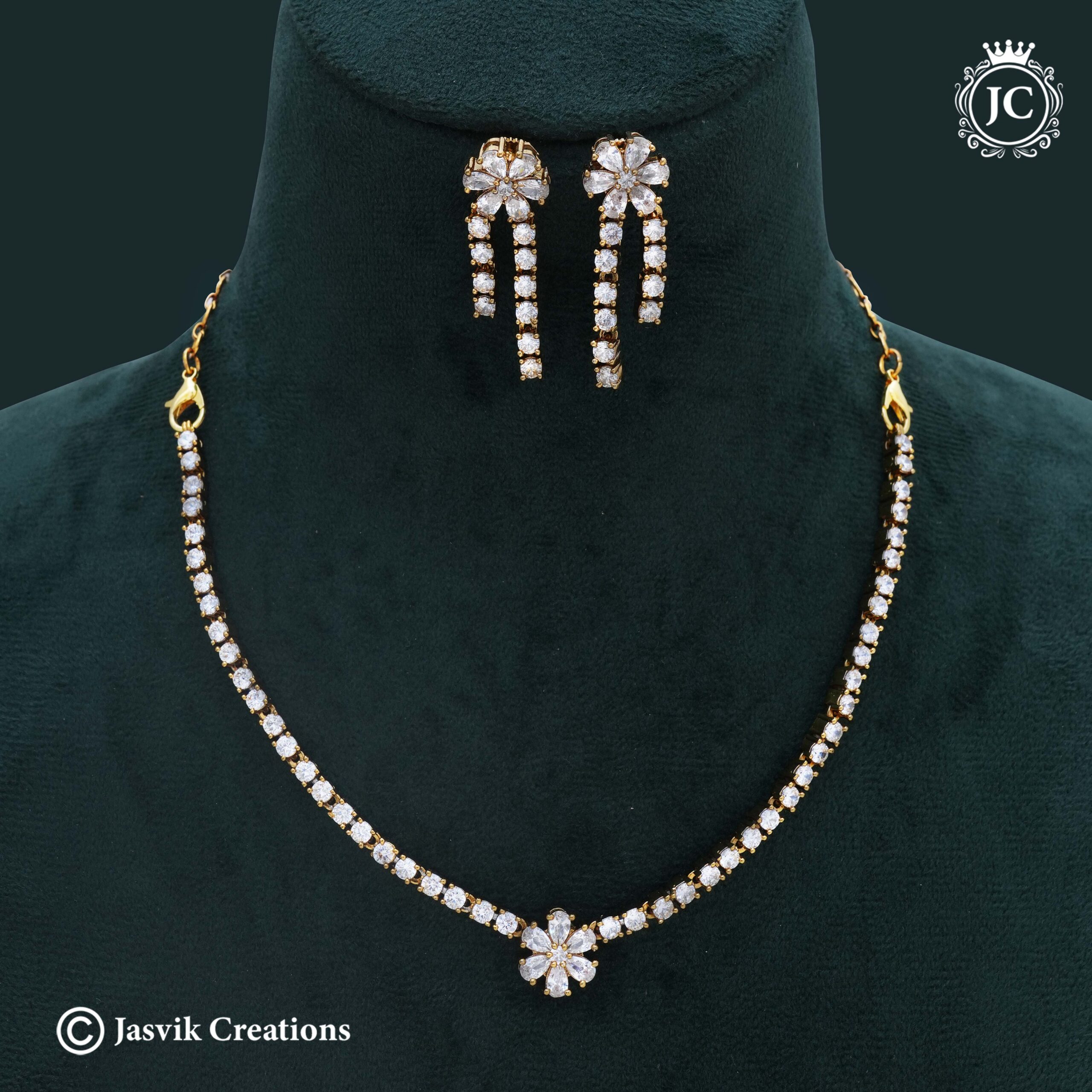 Design: The necklace features a sleek, stone-studded chain with a central floral motif, crafted with precision to highlight its brilliance.