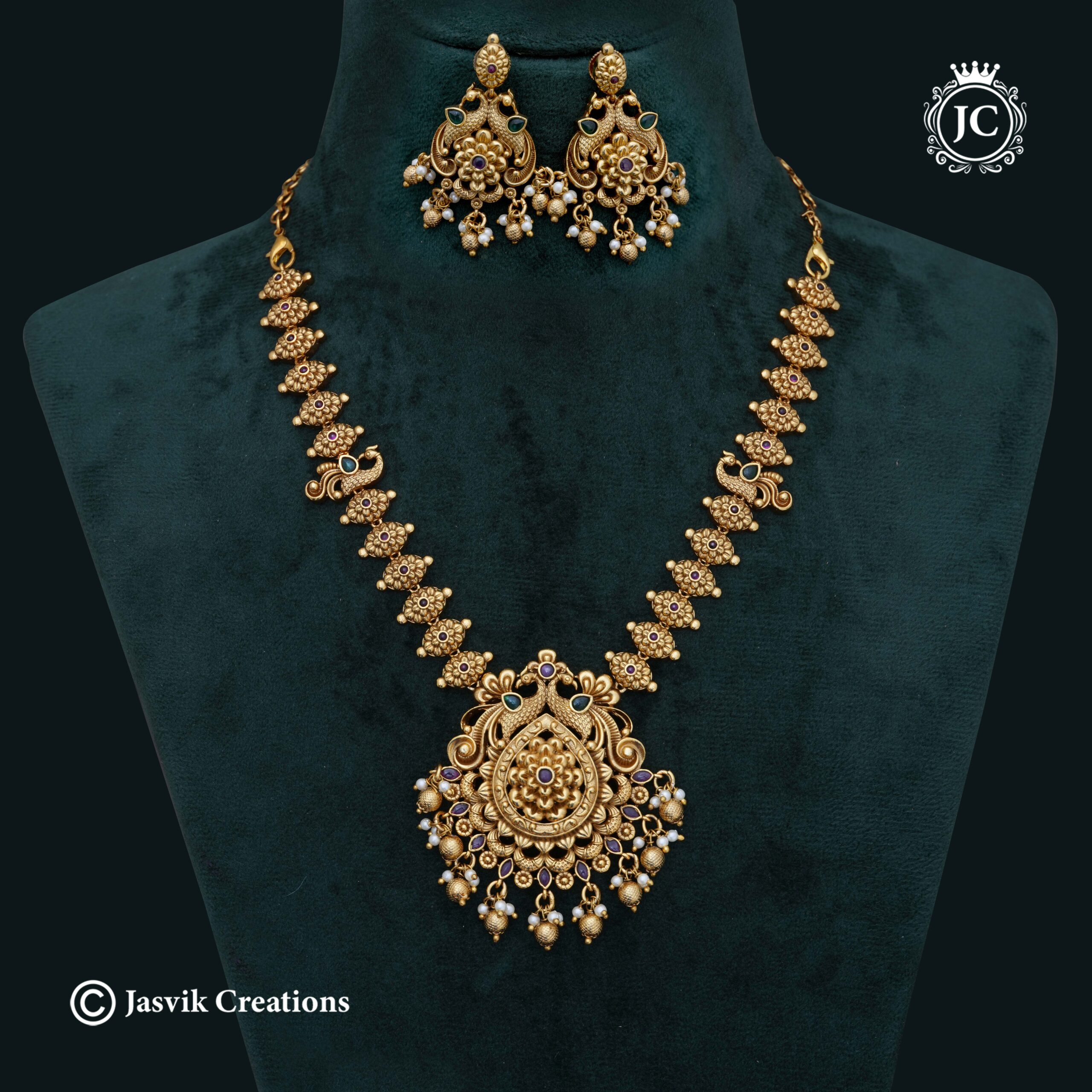 Design: Intricate central pendant with floral and geometric detailing, complemented by matching earrings