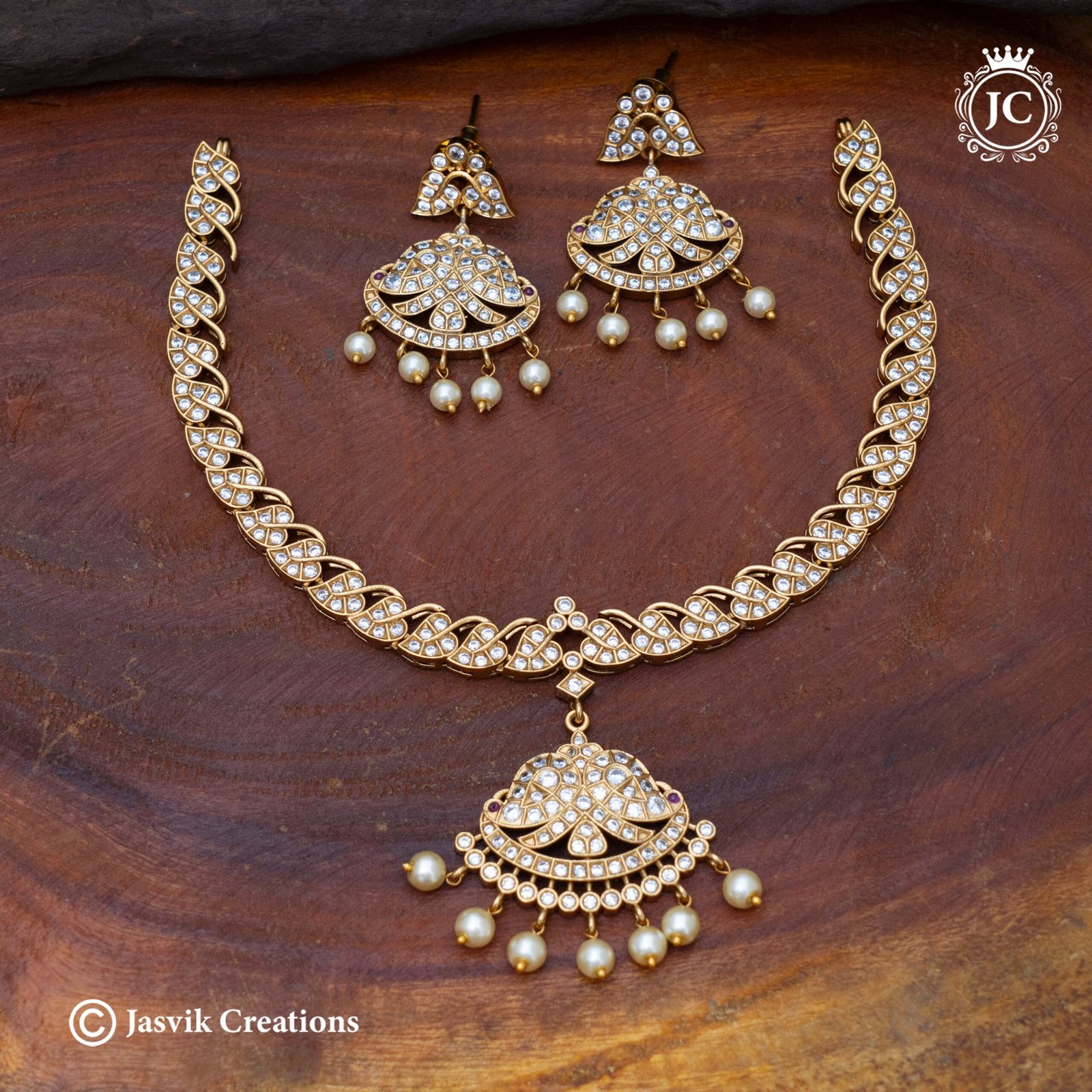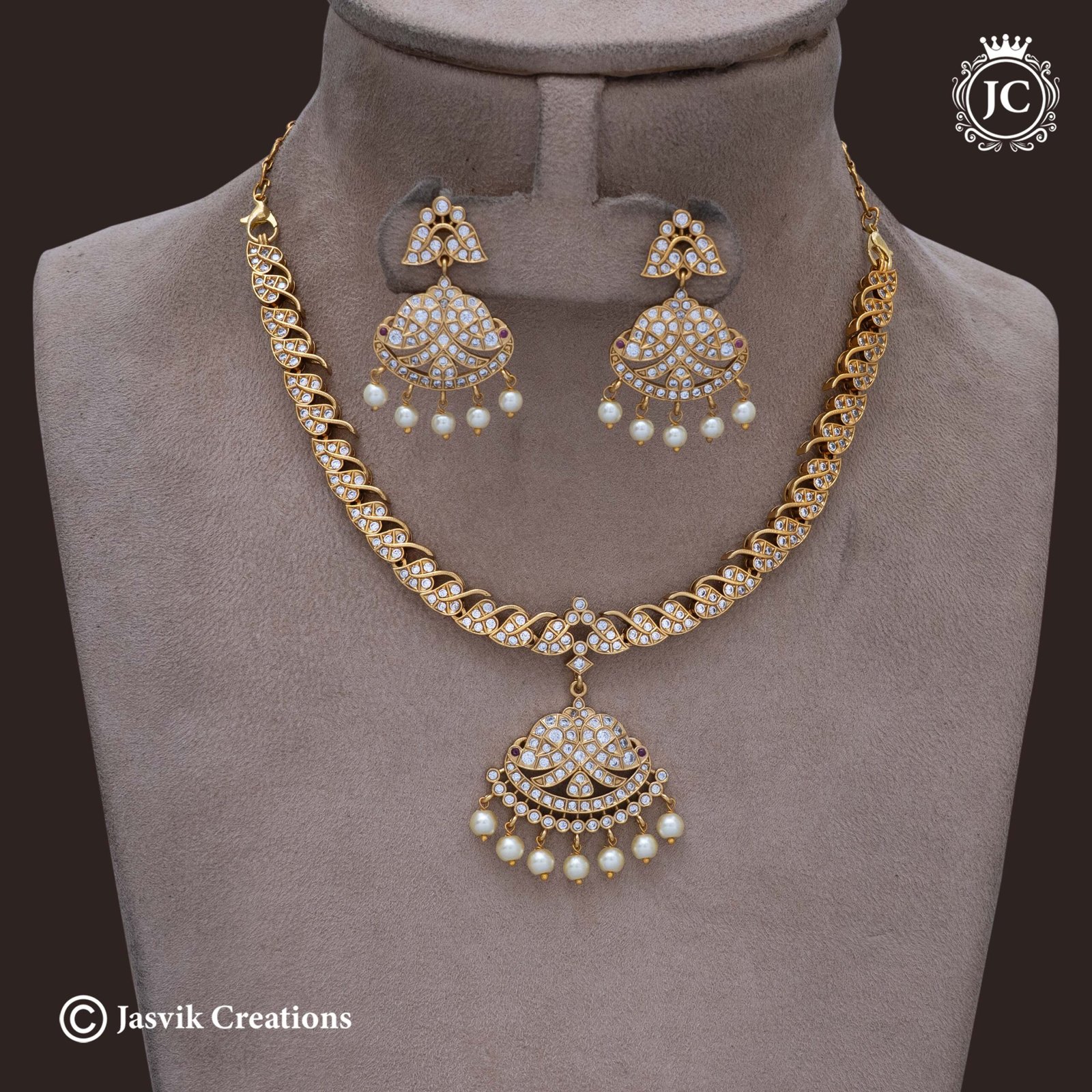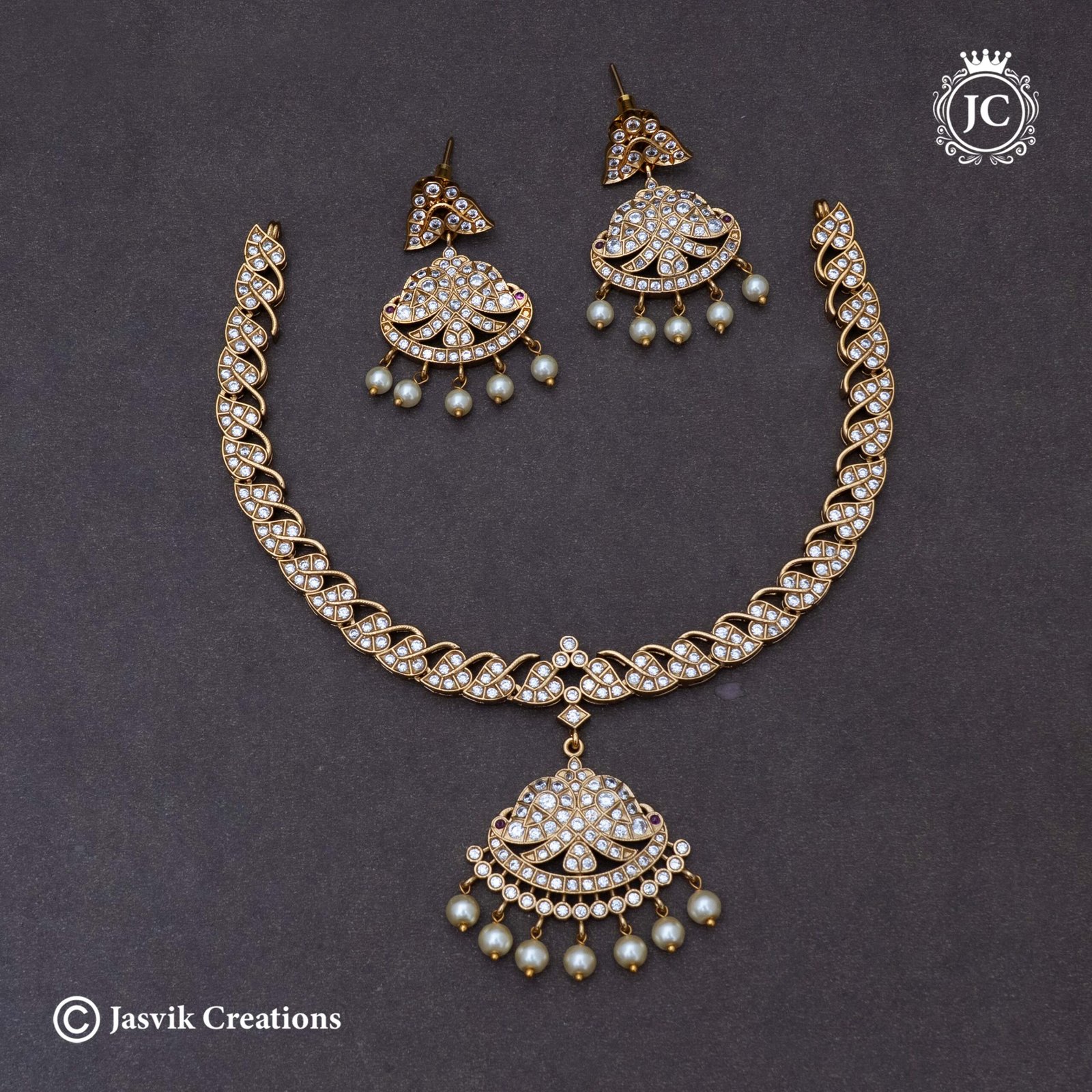 Pendant & Earrings: Both feature a dome or temple-inspired design (often called Attikai or Choker/Haram in South Indian jewelry) completely covered in sparkling white AD stones. The bottom edge of the pendant and earrings is gracefully finished with a fringe of small white imitation pearl drops.