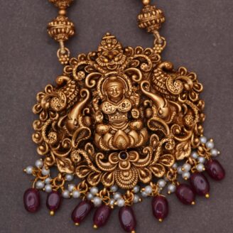 The set includes a pair of matching stud earrings that are a miniature version of the pendant’s centerpiece, with a small Lakshmi figure in a circular or oval motif. This mid haram is a perfect blend of a simple chain with a significant, devotional pendant, making it a versatile and cherished piece for festive and formal occasions.