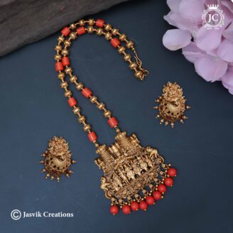The set includes a pair of matching stud earrings that are a miniature version of the pendant’s centerpiece, with a small Lakshmi figure in a circular or oval motif. This mid haram is a perfect blend of a simple chain with a significant, devotional pendant, making it a versatile and cherished piece for festive and formal occasions.