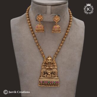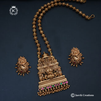 The set includes a pair of matching stud earrings that are a miniature version of the pendant’s centerpiece, with a small Lakshmi figure in a circular or oval motif. This mid haram is a perfect blend of a simple chain with a significant, devotional pendant, making it a versatile and cherished piece for festive and formal occasions.