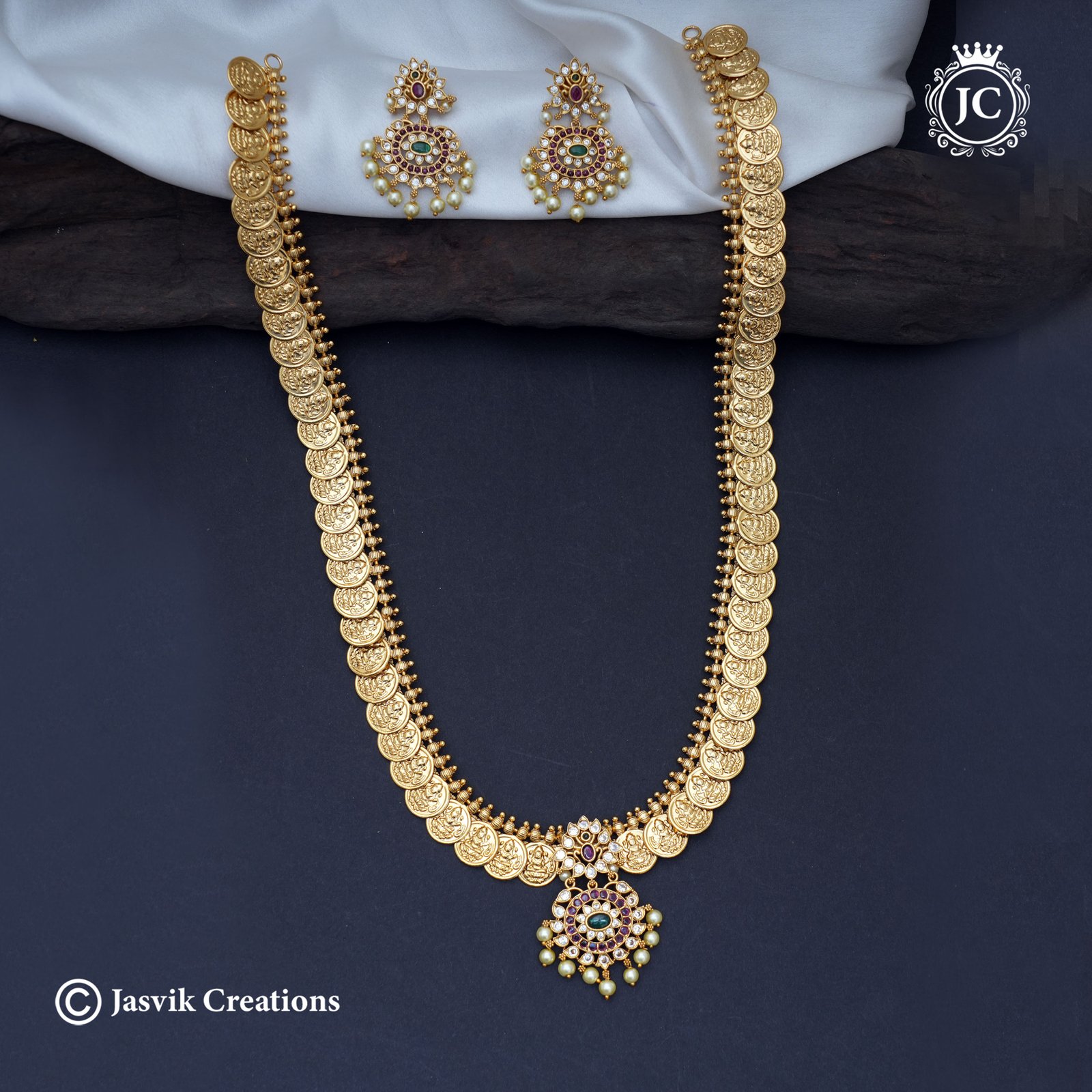 Chain Structure: The main body of the necklace is composed of many small, repeated, stamped or cast gold coins (Kasu), which are closely linked together in a continuous pattern]. The coins typically feature a motif, such as a deity like Goddess Lakshmi, making it auspicious.