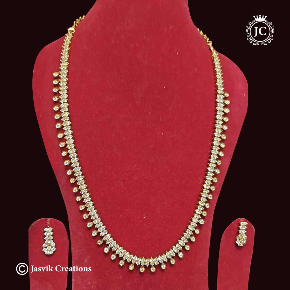 This is an elegant Premium Diamond-Look White Stone Haram (long necklace) set, featuring a delicate arrangement of brilliant white, diamond-cut stones and small gold-toned drops, creating a stunning, high-end appearance. The set includes a matching pair of stud earrings. It is displayed on a red velvet bust, highlighting its traditional yet sophisticated design, perfect for weddings or festive occasions.