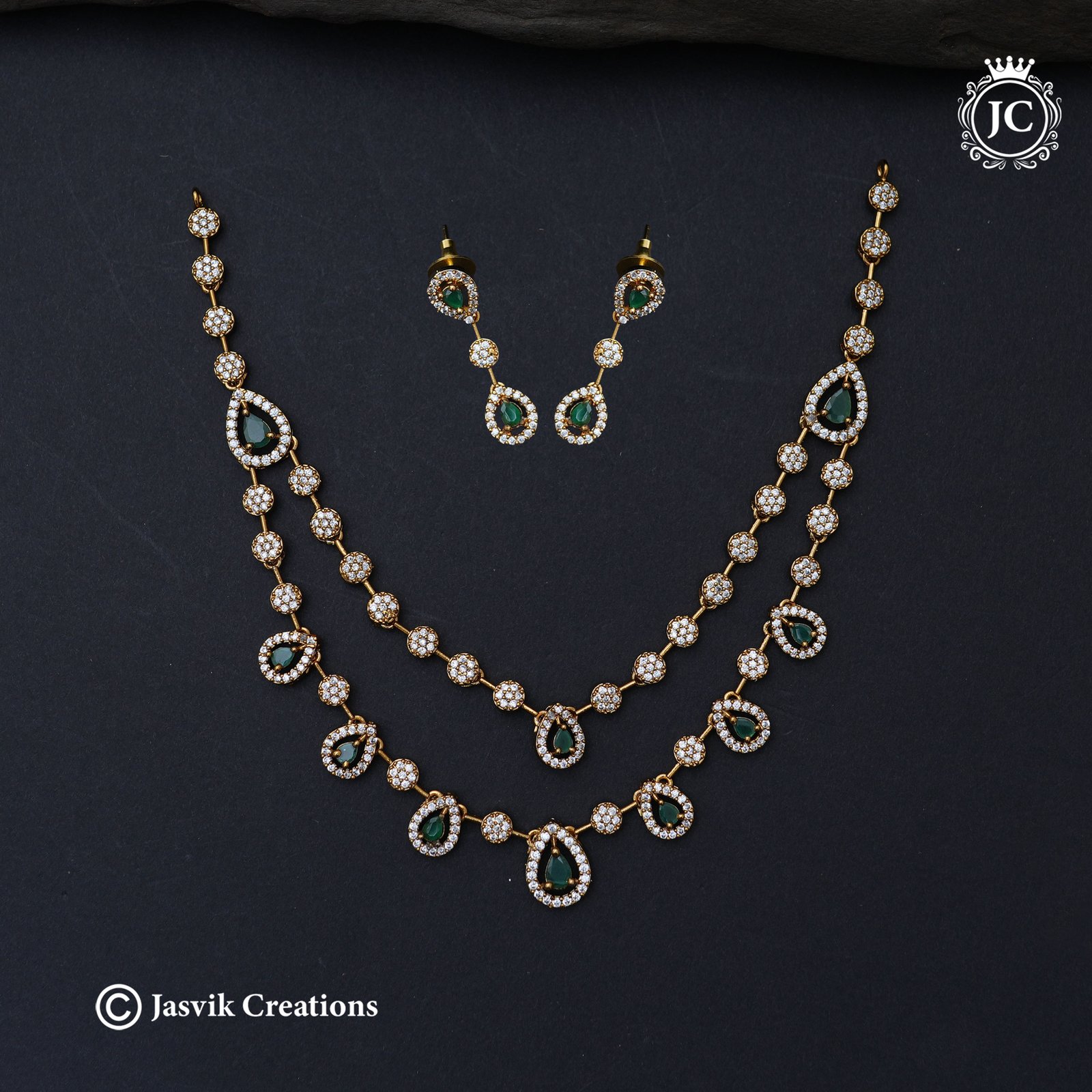 Design: The earrings are matching small drops, typically featuring the pear-shaped green stone surrounded by a halo of clear white AD stones, suspended from a line of the white stone clusters.