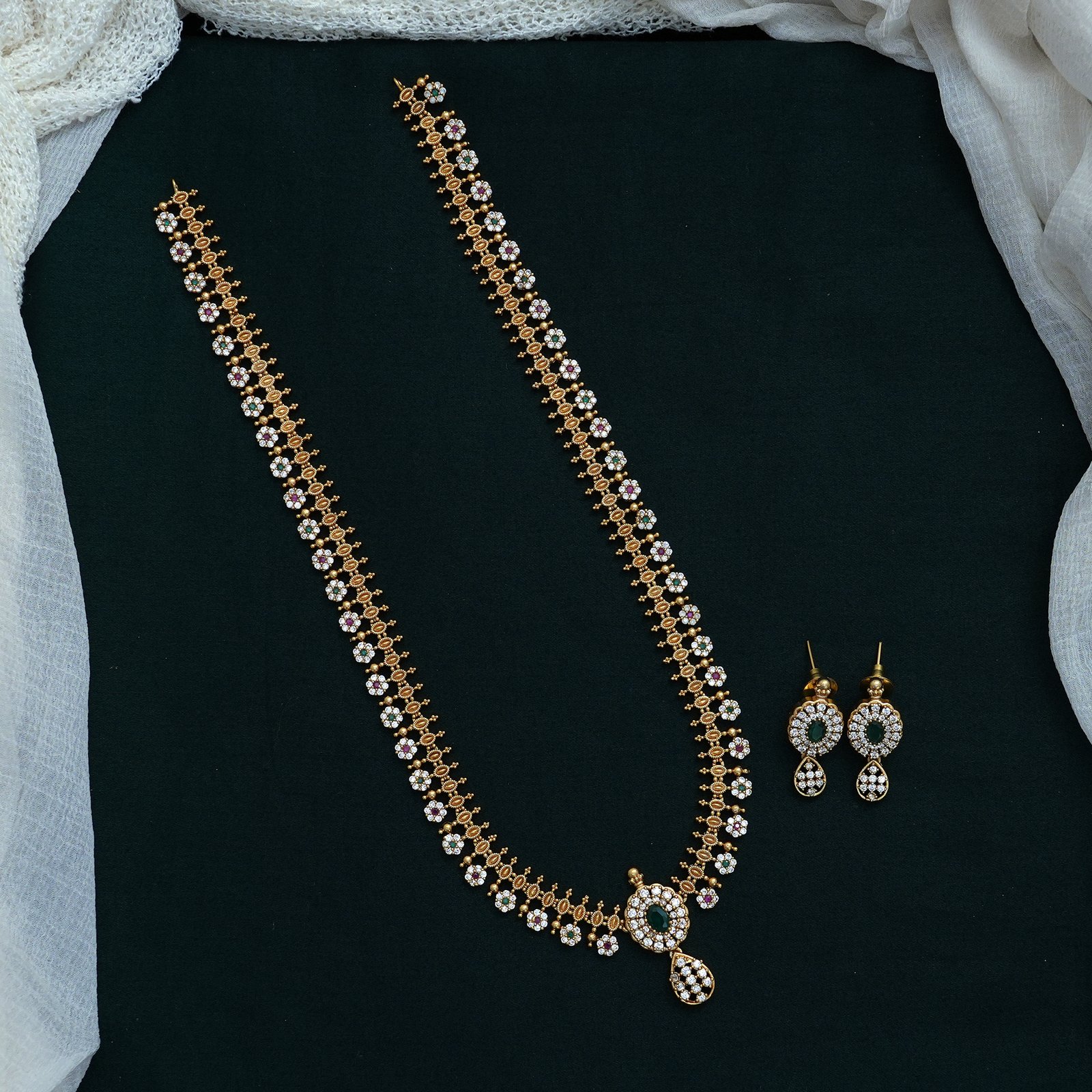 This is a premium and elegant “Haram,” or long necklace, in a trending style. The set features a rich gold-tone finish and is highlighted by a series of beautiful emerald-green stones. The set includes a necklace and a pair of matching earrings.