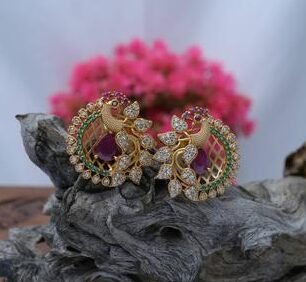 These premium AD (American Diamond) matte earrings, model JCER040, feature a detailed peacock design. They are crafted with a gold-toned base and a matte finish. Each earring is embellished with sparkling American Diamonds and vibrant red and green stones. The peacock’s body is a deep red stone, while its fanned feathers are outlined with green stones and filled with white American Diamonds. They appear to be a stud style earring with a rounded shape.