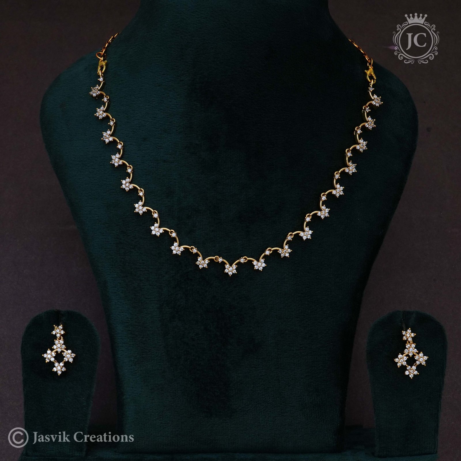 Matching Earrings: The set includes a pair of earrings that are a miniature version of the necklace’s floral motif. Each earring is a single floral cluster of American Diamonds with a small, graceful dangle.