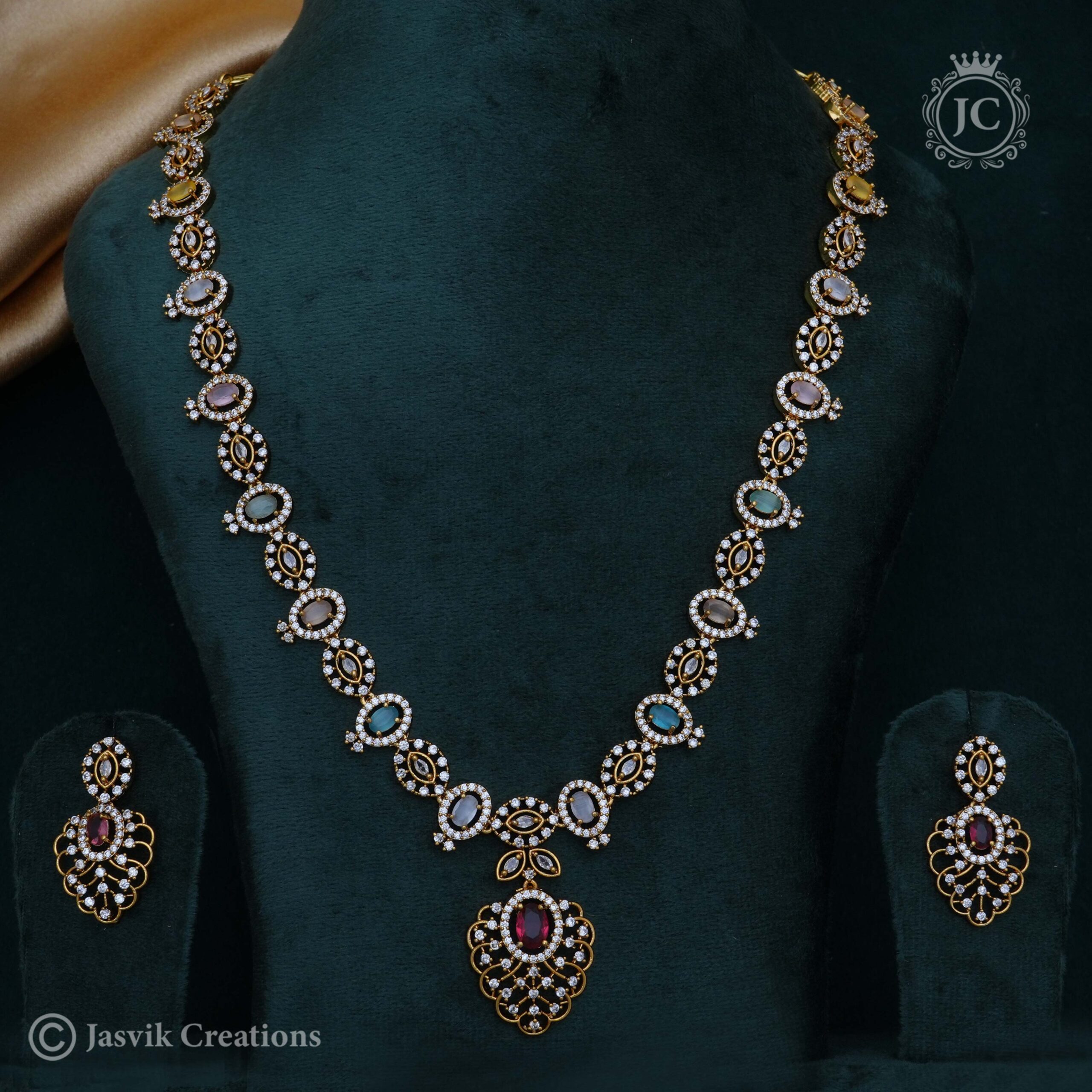 Maintenance: To preserve the necklace’s sparkle and finish, it is essential to store it in a dry, airtight container. It should be kept away from perfumes, water, and other chemicals, which can tarnish the plating and dull the stones.