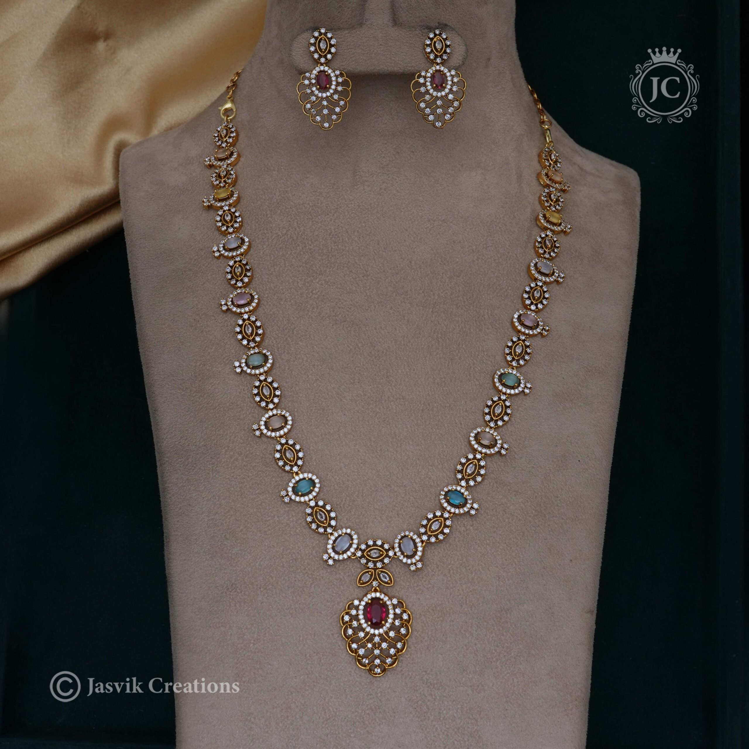 Design and Stones: The defining characteristic of this haram is its prominent use of vibrant Red AD stones. The design features a series of repeating motifs, each meticulously set with a Red AD stone that is framed by smaller, brilliant white AD stones. This creates a striking contrast that is both classic and eye-catching. The necklace culminates in a beautiful, ornate pendant that serves as the focal point, often with a large central green stone surrounded by a delicate halo of white stones.