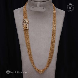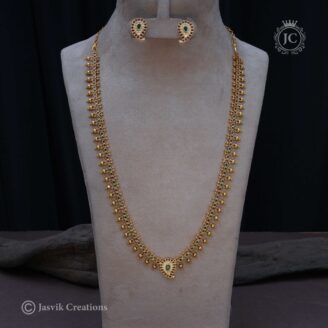 This is a Premium Manga Coin Haram, a long necklace that beautifully blends two classic motifs of traditional South Indian jewelry: coins and mango shapes. The necklace has a rich, antique gold finish that gives it a timeless and authentic look.