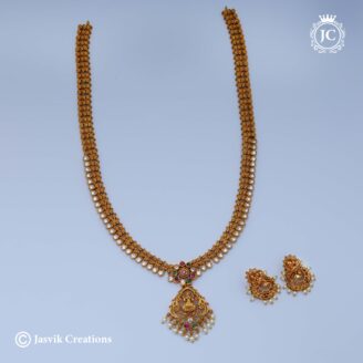 The set includes a pair of matching earrings that are a smaller version of the manga motif, with the same mix of stones. This haram is a perfect choice for adding a touch of traditional elegance to any festive or ceremonial attire.