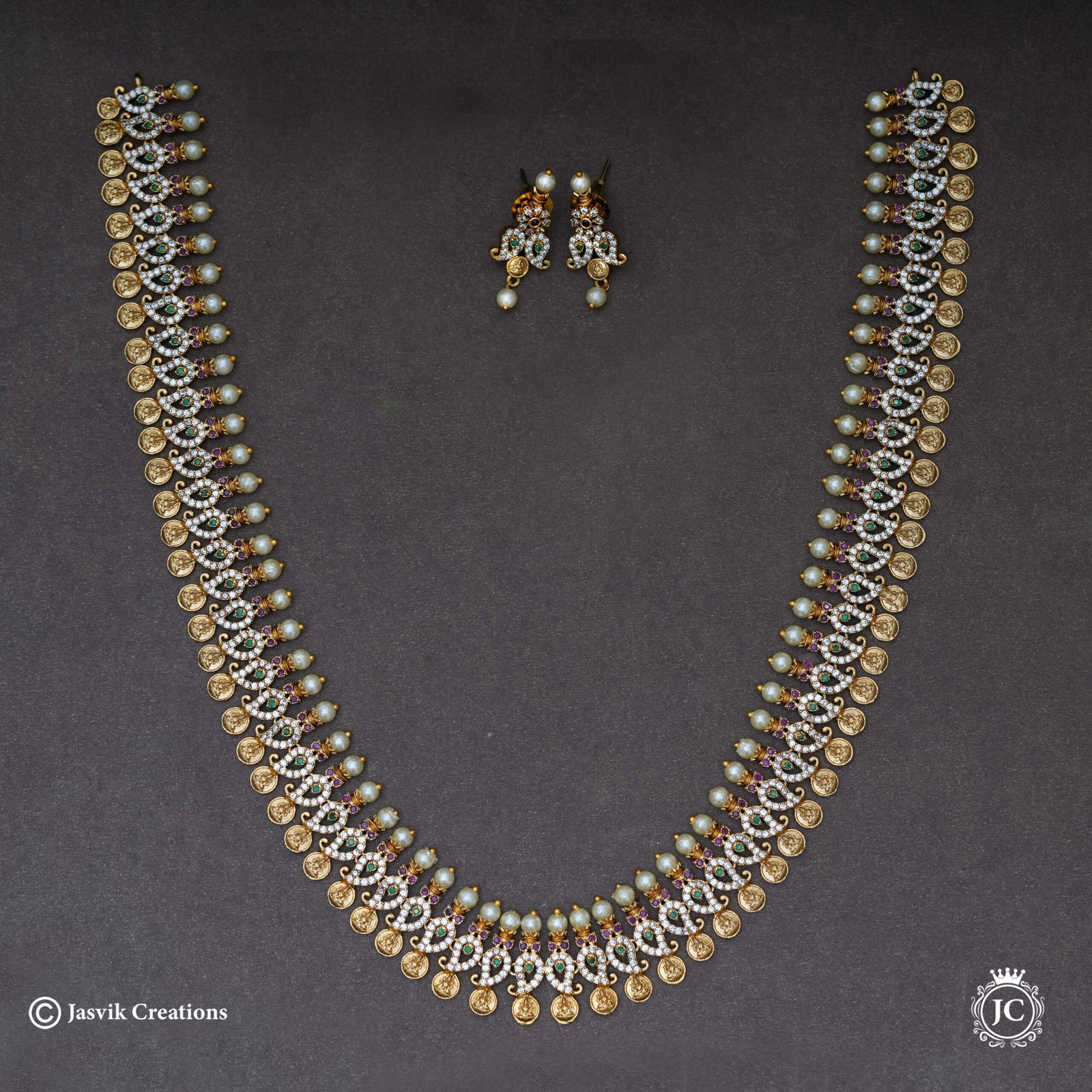 This luxurious long necklace (Haram) is a beautiful representation of traditional South Indian jewelry, combining classic motifs with vibrant stone work.