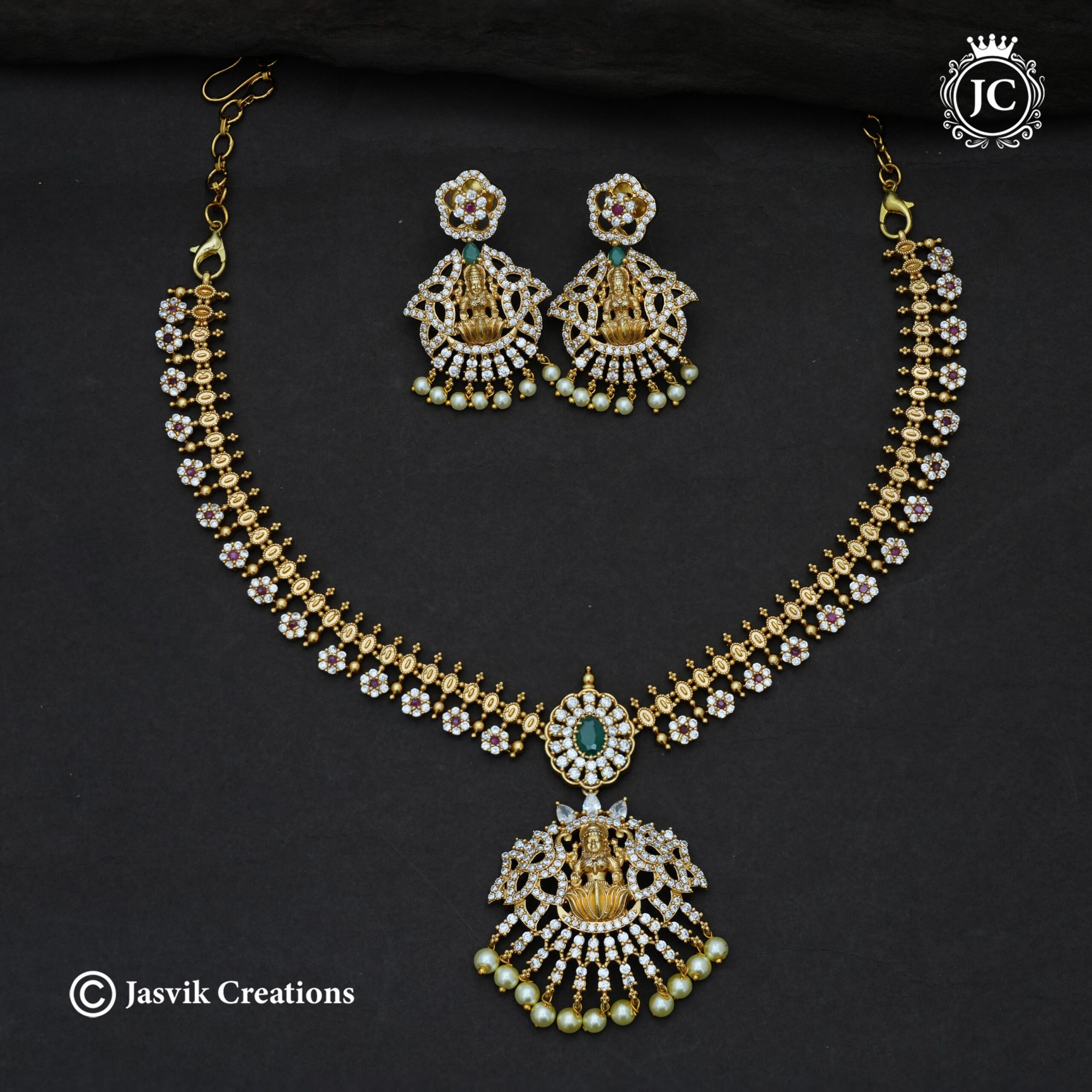 This elaborate necklace set features a majestic Goddess Lakshmi pendant, seated upon a lotus and surrounded by a brilliant sunburst of white CZ stones. The necklace chain is uniquely designed with a double-layered gold-toned structure, punctuated by delicate ruby and emerald stone floral accents. Accompanied by matching heavy statement earrings, this set is finished with clusters of golden pearls (Ghungroo), offering a rich and regal aesthetic for special occasions.