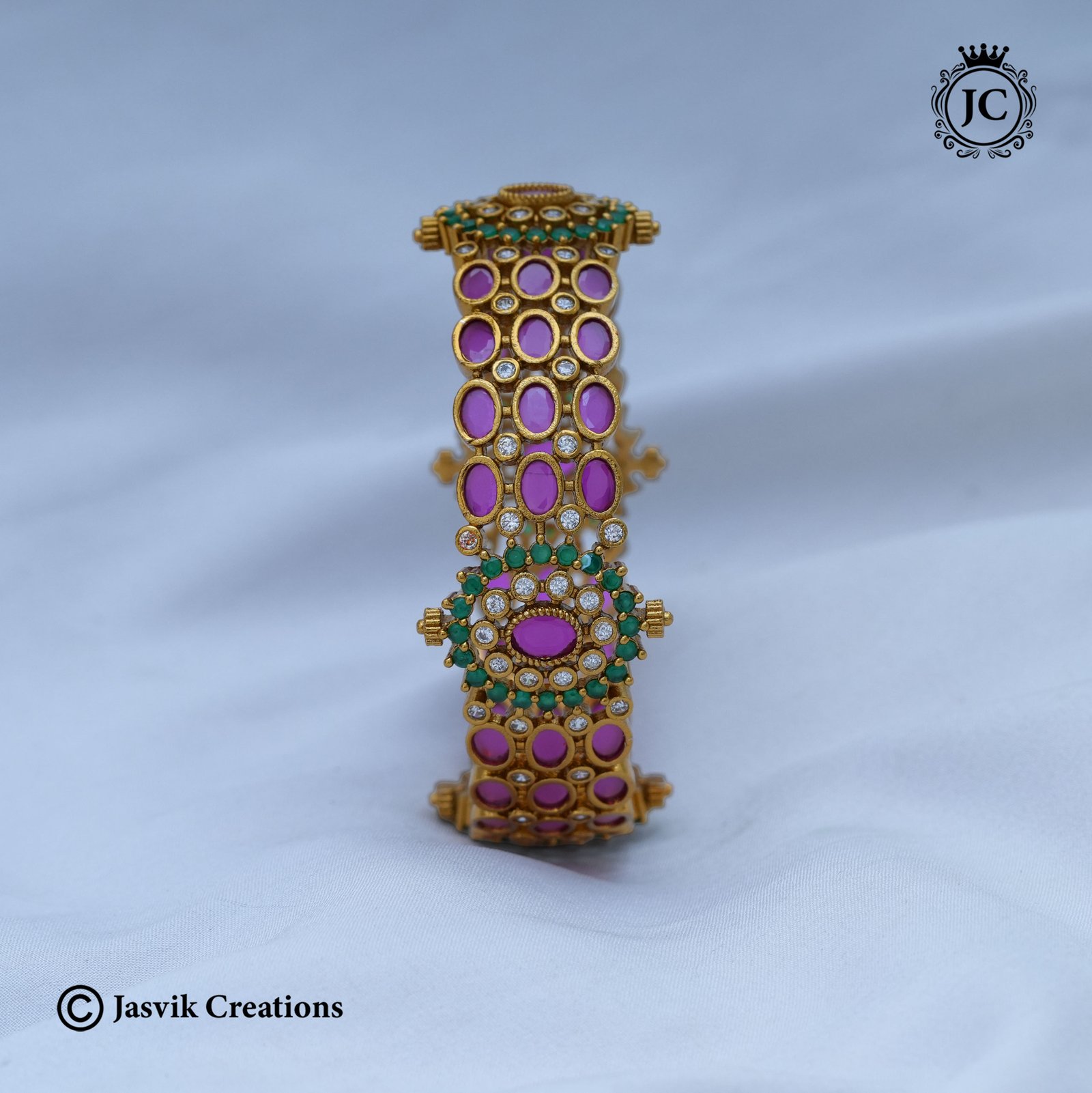 It appears to be an intricate, traditional-style kada/bangle with an antique or premium matte finish, featuring prominent ruby (or magenta) and green stones (likely Kemp stones or AD/CZ). The central design is particularly elaborate.
