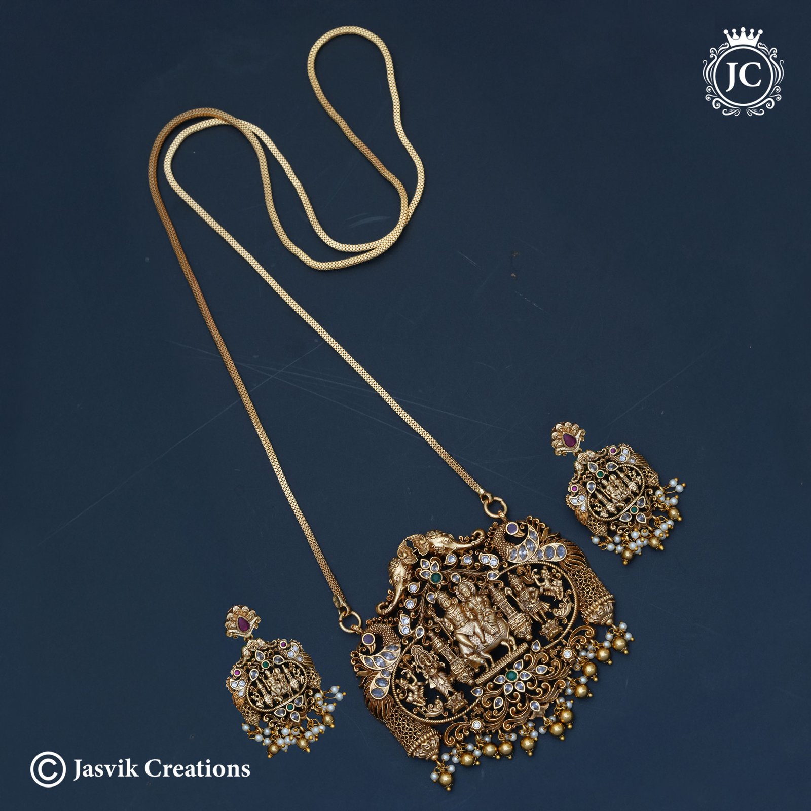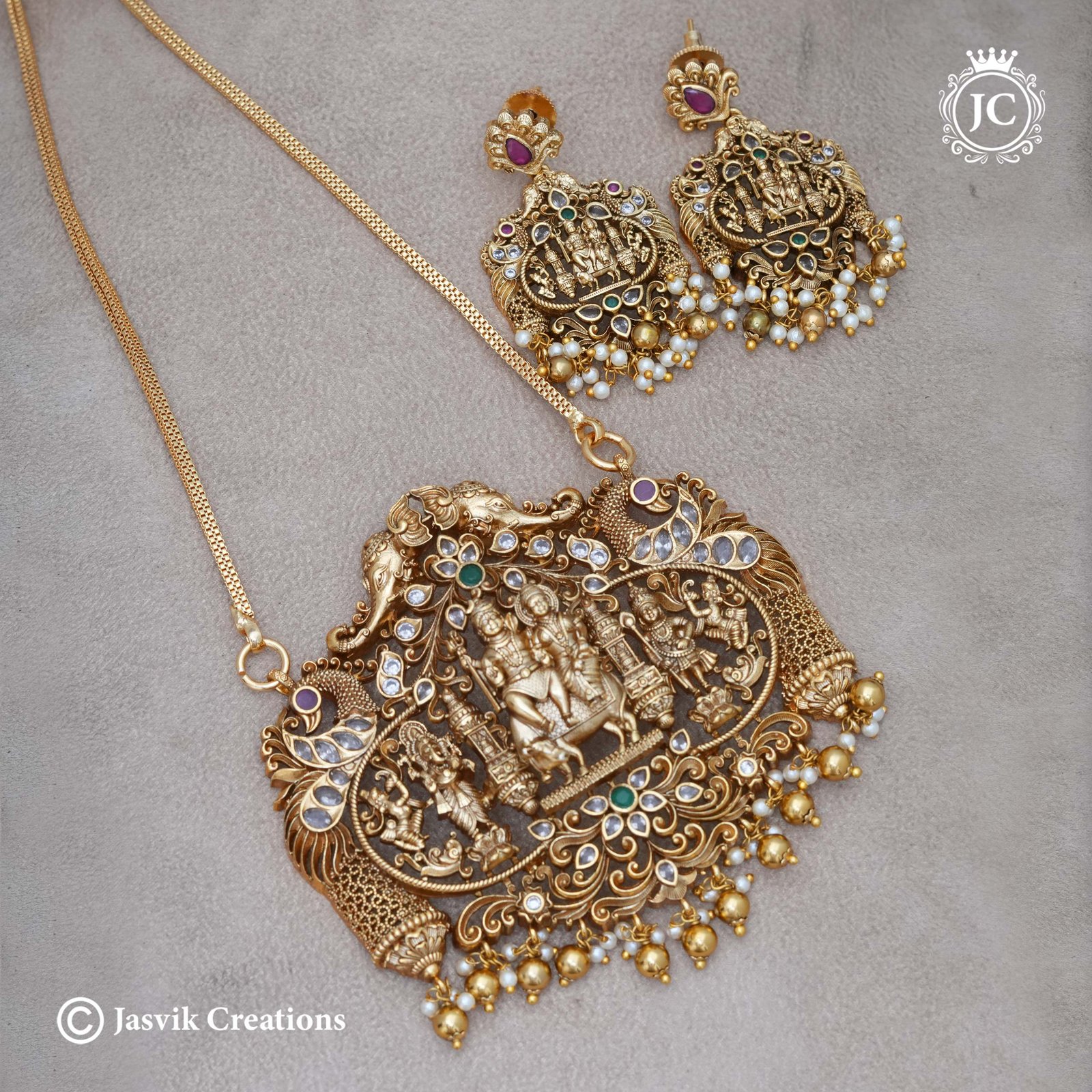 Matching Earrings: Comes with substantial drop earrings that mirror the Sivan-Parvathy motif, finished with delicate pearl and gold bead clusters.