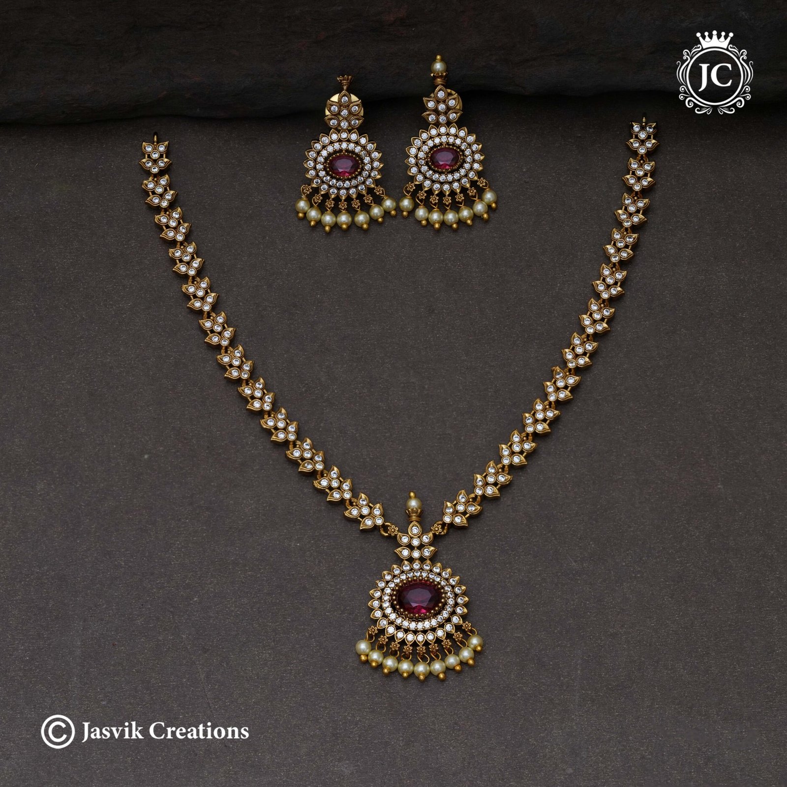 Pendant/Centerpiece: The oval-shaped main stone (available in Red, Baby Pink, Lavender, or Green) is framed by sparkling American Diamonds (AD) and finished with delicate pearl bead drops.