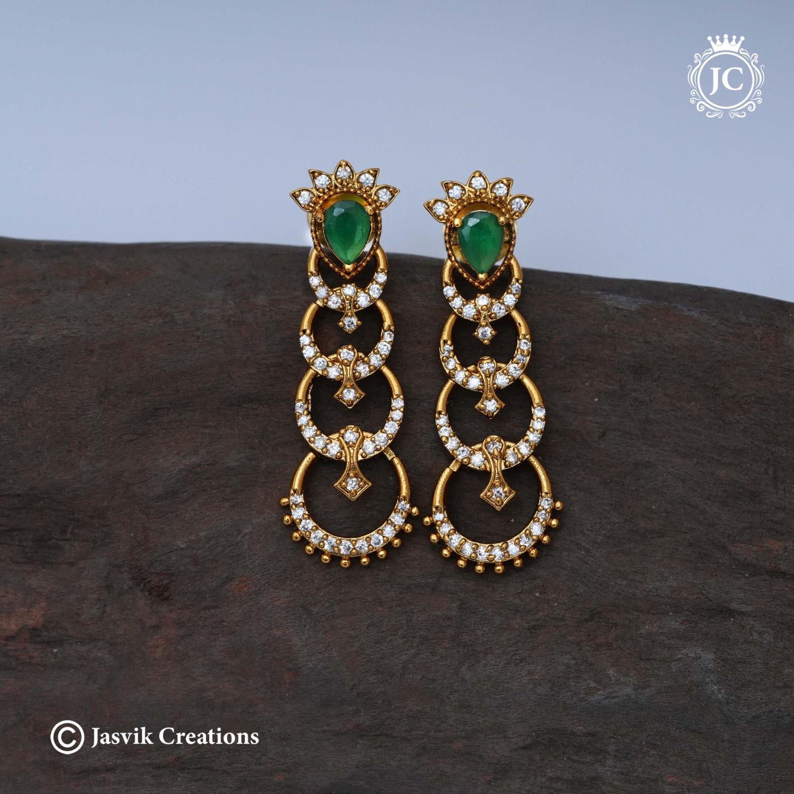 Design: The earrings start with a stud top adorned with a pear-shaped green stone (likely an emerald or equivalent) surrounded by a crown of smaller white stones.