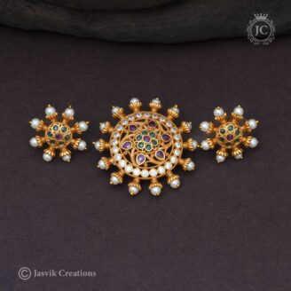 Swarna Impon Lavender Set: A specifically designed Impon (five-metal alloy) set that highlights a lavender stone central piece, combining traditional metals with contemporary color trends.