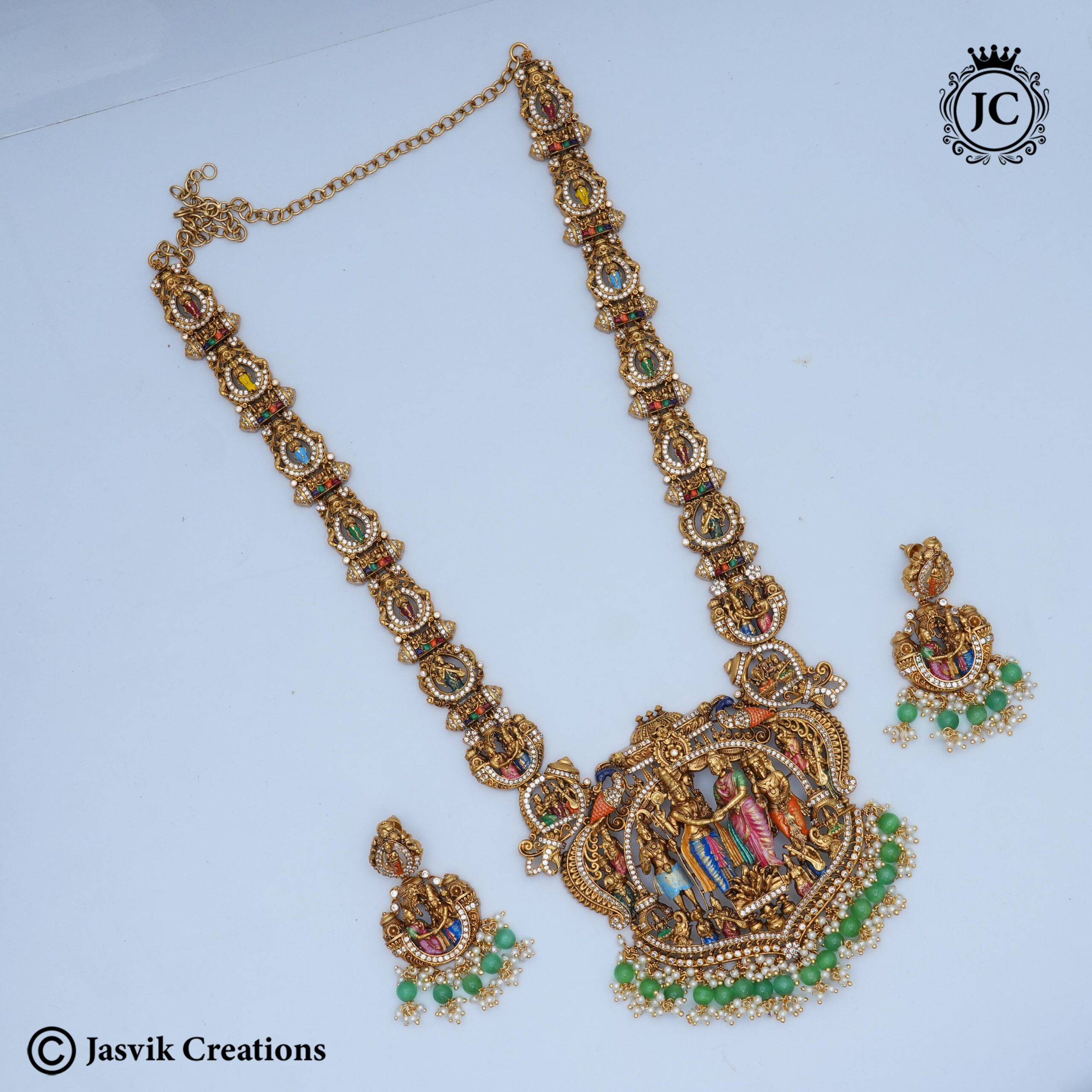 Design Narrative: This Haram (long necklace) tells a divine story. The central pendant and side motifs depict the Srinivasa Kalyanam—the sacred wedding of Lord Venkateswara (Srinivasa) and Goddess Padmavathi.