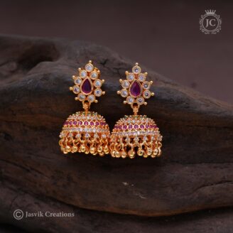 Design: Intricately detailed Lakshmi motif on top, symbolizing prosperity and blessings, paired with a cluster of vibrant red stones for a striking finish.