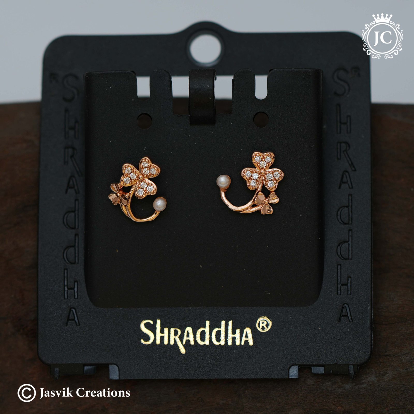 A charming and contemporary pair of cuff-style stud earrings featuring a warm rose gold-tone finish. The design centers on a detailed three-leaf clover or flower motif, intricately paved with brilliant American diamond (AD) or cubic zirconia (CZ) stones. A delicate curve extends from the main motif, terminating in a single, small faux pearl. This unique shape allows them to be worn as small ear climbers or decorative studs. Presented on a “Shraddha” branded display, these imported earrings are a whimsical and fashionable choice for daily wear or adding subtle sparkle.