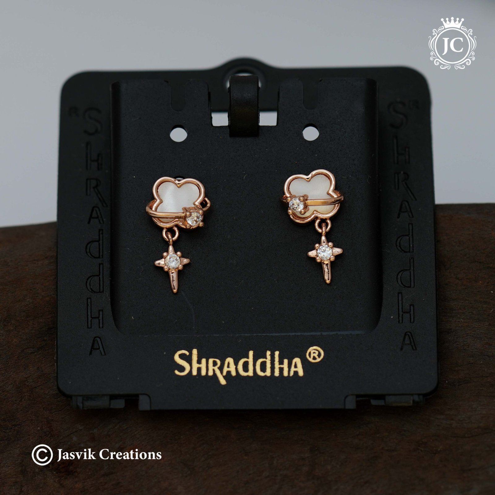 A unique and playful pair of drop earrings with a beautiful rose gold-tone finish. The main post features a stylized cloud motif inlaid with a smooth, iridescent material (likely mother-of-pearl or enamel) and encircled by a slim rose gold band, giving it a planetary or celestial feel. A single sparkling American diamond (AD) or cubic zirconia (CZ) stone is set on the cloud. Dangling below is a brilliant four-pointed star or cross charm, also set with a tiny AD/CZ stone. Presented on a “Shraddha” branded display, these imported earrings are a fashionable and whimsical accessory, perfect for adding personality to an outfit.