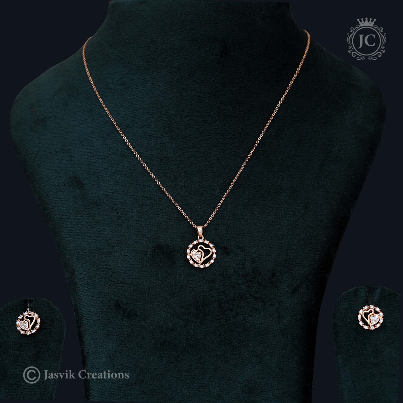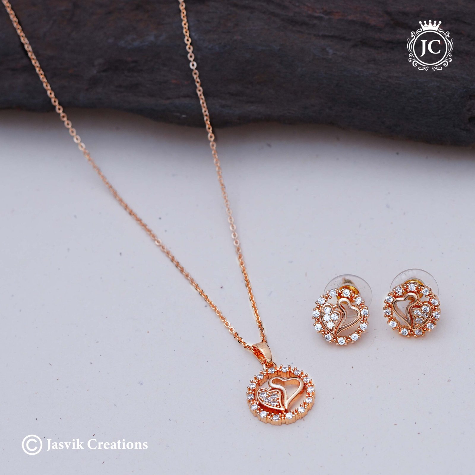 This is a beautiful jewelry set consisting of a necklace and a pair of matching stud earrings. The set is made of rose gold and features a heart-within-a-heart design.