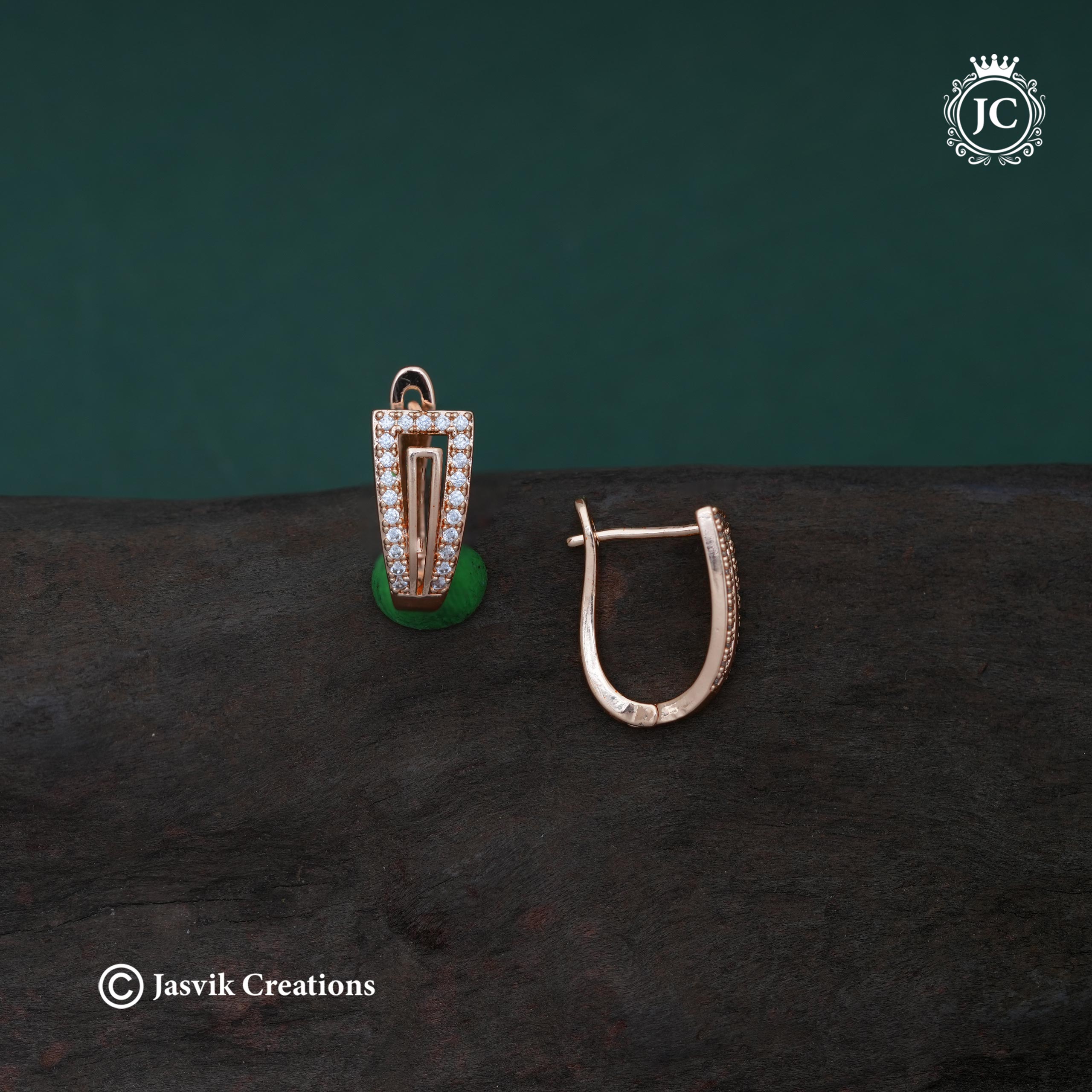 Crafted by Jasvik Creations, these earrings feature a distinct J-type or “half-hoop” design that elegantly hugs the earlobe. The structure is defined by a tapered, rectangular frame that blends polished rose gold with brilliant gemstone accents for a refined, contemporary look.