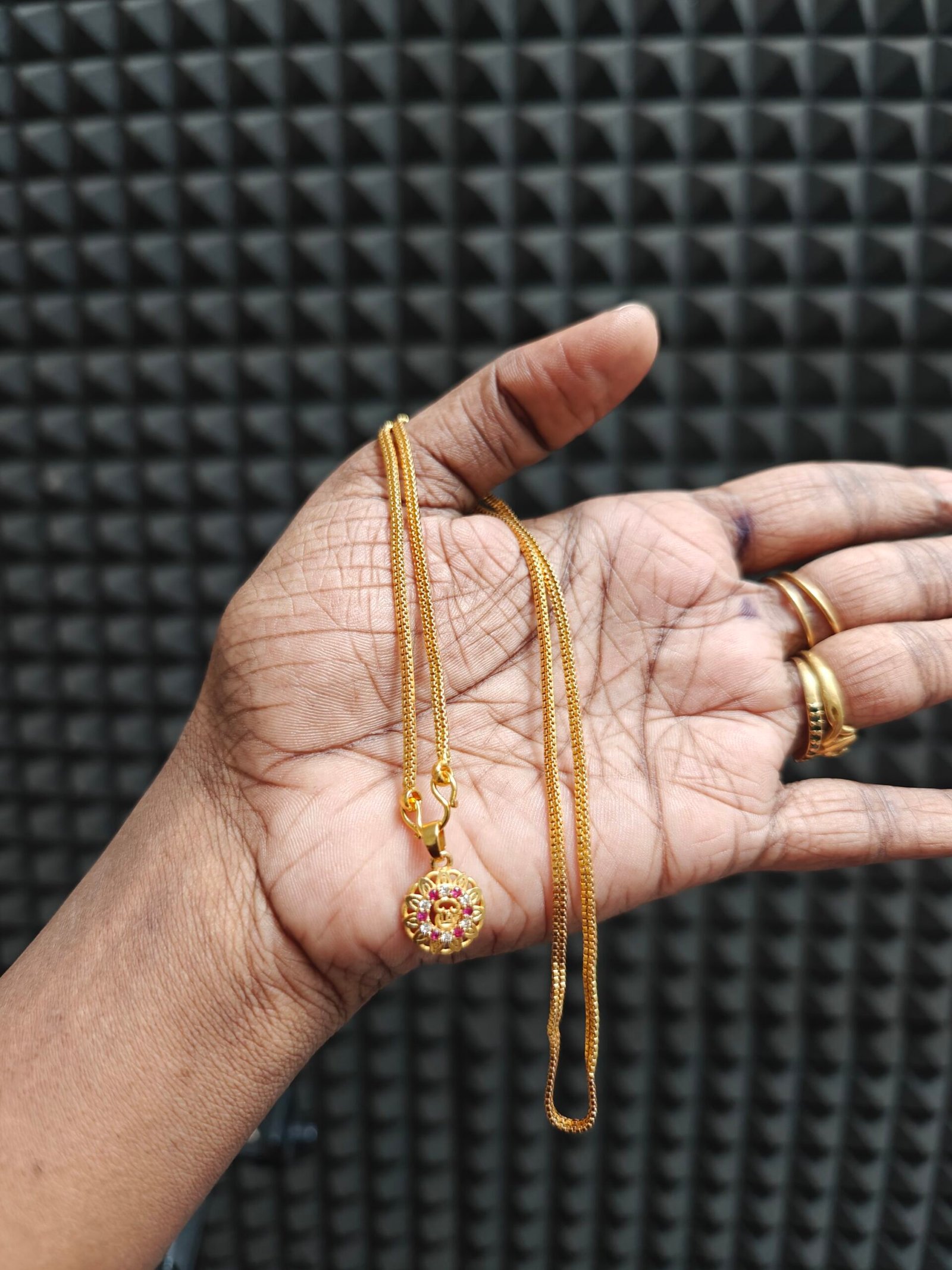 Material: The chain and pendant are made of imitation or artificial jewelry, often brass or alloy, with a gold plating.