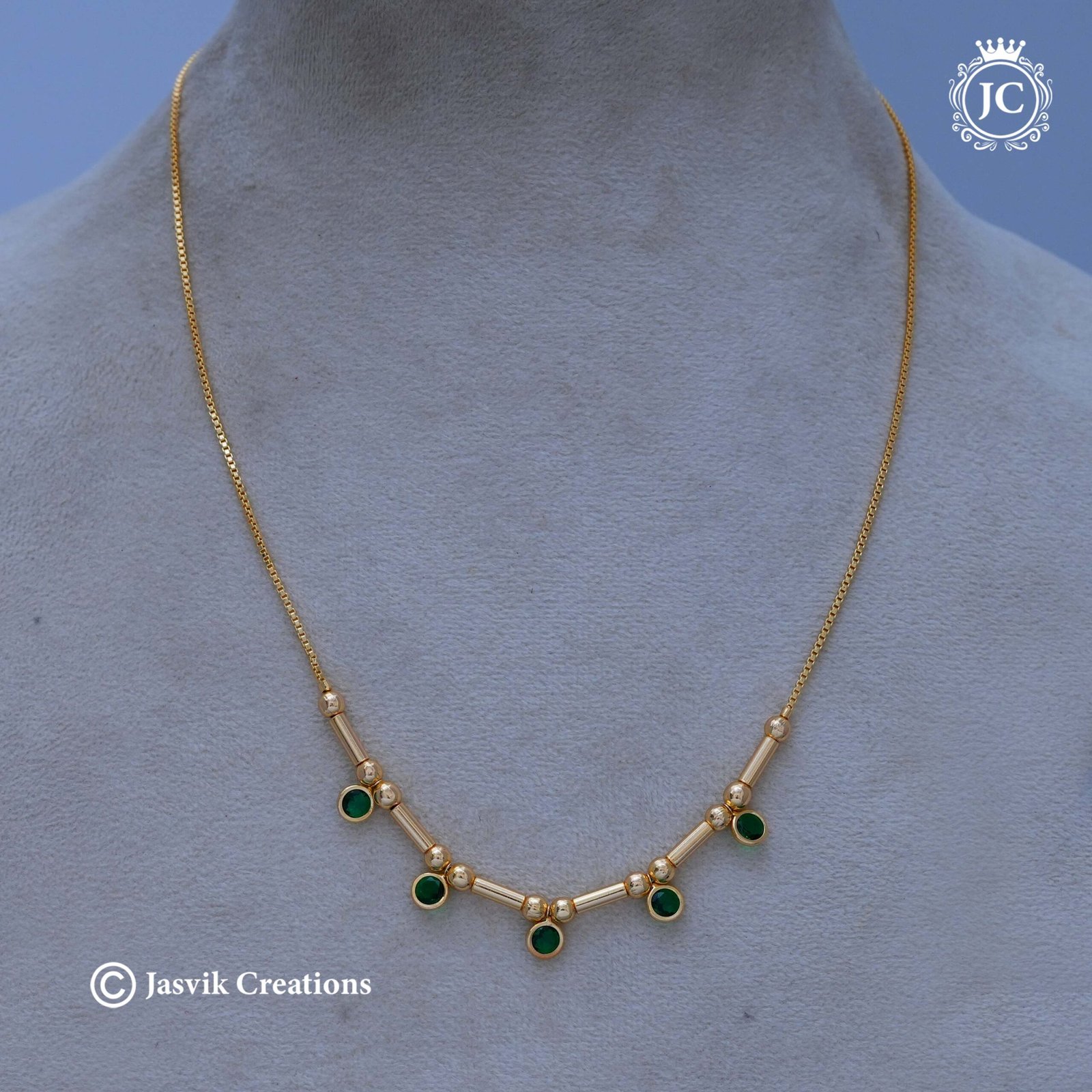 In short, it’s a delicate, short, microplated gold-toned necklace accented with small green stones, perfect for simple elegance.