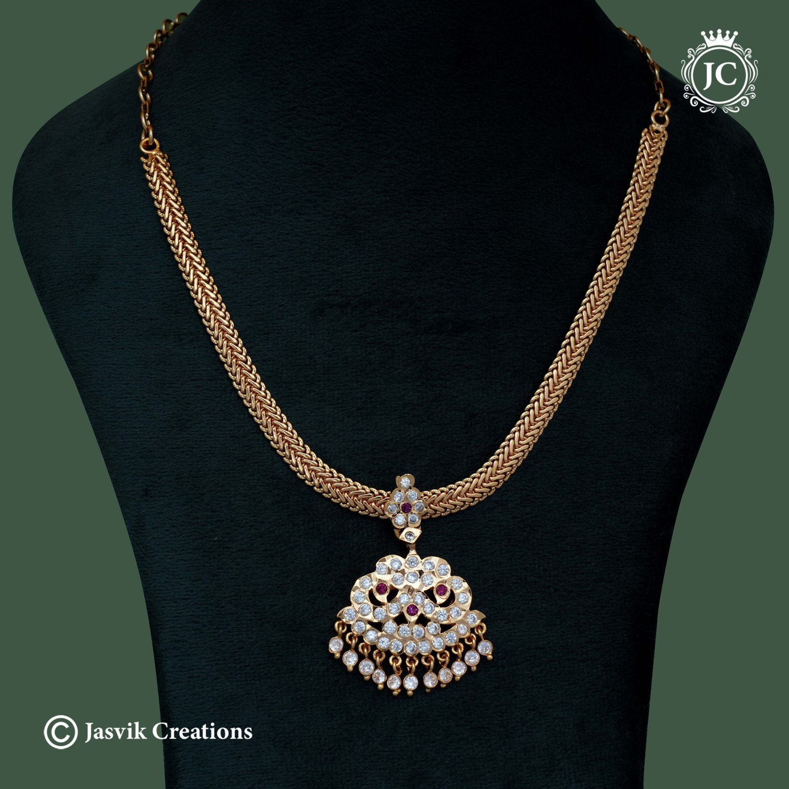 - Design: The necklace features a broad, woven chain with a textured or antique gold finish. The pendant is the highlight, with an intricate design that is fully studded with sparkling white stones, likely American diamonds (AD). Small red stones are strategically placed for a pop of color. The bottom of the pendant is adorned with a fringe of small, hanging white stones, adding a touch of elegance and movement.