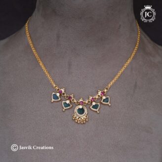 This Vintage-Style Red & White Stone Attikai Necklace is a soulful tribute to traditional South Indian heritage. It captures the essence of “Temple Jewelry,” combining the royal contrast of ruby-red and diamond-white stones with a classic antique gold finish.