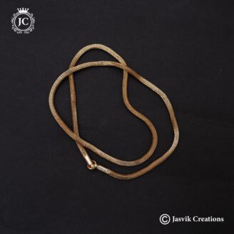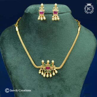 View this post on Instagram A post shared by Jasvik Creations (@jasvik_creation) Necklace: The chain appears to be a flexible, gold-toned snake or rope chain. Pendant: It features a decorative, traditional-style pendant. The pendant is set with a central rectangular ruby-red stone, surrounded by smaller clear and green stones. Small pearl drops hang…