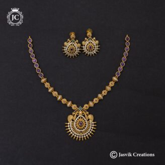 This is a modern yet traditional necklace set with a prominent lotus motif. The piece has a sophisticated matte finish, which gives it a non-reflective, antique-like appearance, a popular trend in contemporary temple jewelry. Design & Motif: The necklace features a centerpiece or a series of pendants in the shape of a lotus flower. The…