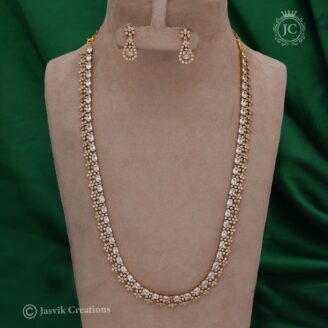 This piece is a classic Premium Haram, a long necklace that is a significant part of traditional Indian jewelry. The “(White)” in the name signifies that the design is predominantly adorned with clear or white stones. The necklace’s design is a series of intricate, interconnected floral or leaf-shaped links. Each link is meticulously studded with…