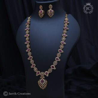 This piece is a classic Premium Haram, a long necklace that is a significant part of traditional Indian jewelry. The “(Ruby)” in the name signifies that the design is predominantly adorned with clear or Red stones. The necklace’s design is a series of intricate, interconnected floral or leaf-shaped links. Each link is meticulously studded with…