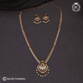 This piece is a classic Premium Haram, a long necklace that is a significant part of traditional Indian jewelry. The “(Ruby)” in the name signifies that the design is predominantly adorned with clear or Red stones. The necklace’s design is a series of intricate, interconnected floral or leaf-shaped links. Each link is meticulously studded with…